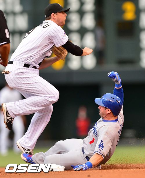 4일 (이하 한국시간) 미국 콜로라도주 덴버 쿠어스 필드에서 열린 2013 메이저리그 콜로라도 로키스와 LA 다저스의 경기, 1회초 1사 주자 1,2루 마이클 영의 유격수 병살타 때 2루에서 닉 푼토가 포스아웃을 당하고 있다.