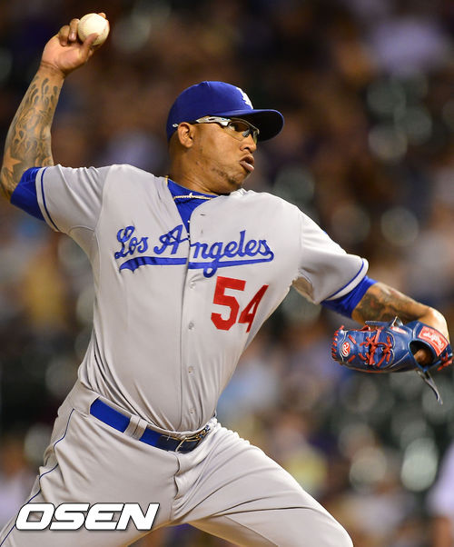 4일 (이하 한국시간) 미국 콜로라도주 덴버 쿠어스 필드에서 열린 2013 메이저리그 콜로라도 로키스와 LA 다저스의 경기, 8회말 무사 주자 1루 콜로라도 르마이유 타석에 마운드에 오른 다저스 벨리사리오가 힘차게 공을 뿌리고 있다.
