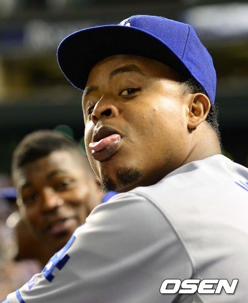 4일 (이하 한국시간) 미국 콜로라도주 덴버 쿠어스 필드에서 열린 2013 메이저리그 콜로라도 로키스와 LA 다저스의 경기, 덕아웃에서 내일 경기에 선발 등판하는 다저스의 볼케스가 취재진을 향해 메롱을 하고 있다.