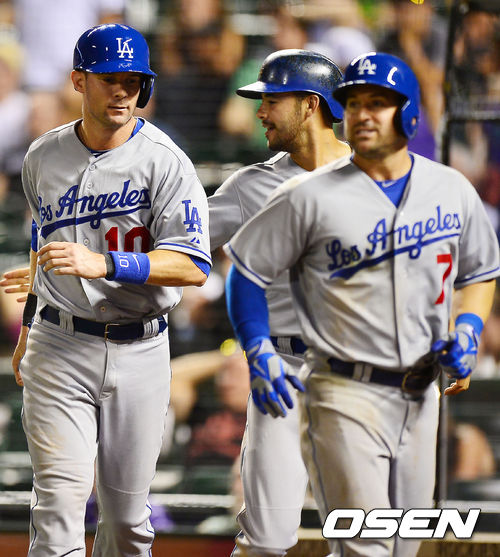4일 (이하 한국시간) 미국 콜로라도주 덴버 쿠어스 필드에서 열린 2013 메이저리그 콜로라도 로키스와 LA 다저스의 경기, 9회초 다저스 마크 엘리스의 타구가 좌익수의 실책으로 이어지면서 마이클 영과 이디어가 푼토가 홈을 밟고 있다.