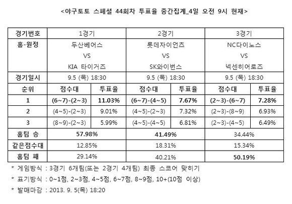KBO 3경기 대상 야구토토 스페셜 44회차 투표율 중간집계