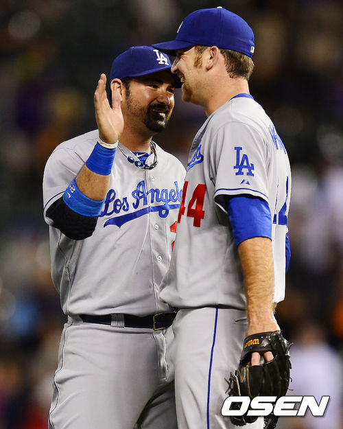 경기를 마치고 다저스 곤살레스와 위드로가 승리의 기쁨을 나누고 있다. / rumi@osen.co.kr