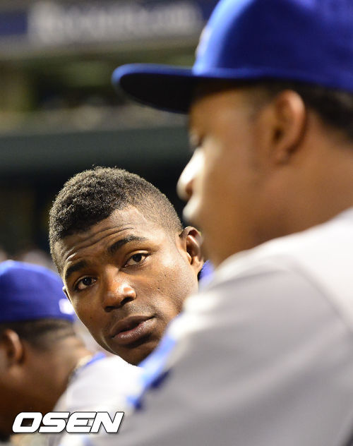 다저스 이적 후 첫 선발이 예정된 에디슨 볼퀘즈와 푸이그가 얘기를 나누고 있다. / rumi@osen.co.kr