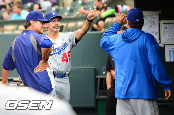 덕아웃에서 류현진과 힐만 코치와 장난을 칠때 돈 매팅리 감독이 흐뭇하게 바라보고 있다. / rumi@osen.co.kr