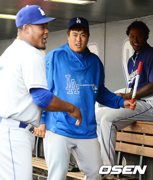 덕아웃에서 류현진과 유리베와 장난을 치고 있다. / rumi@osen.co.kr