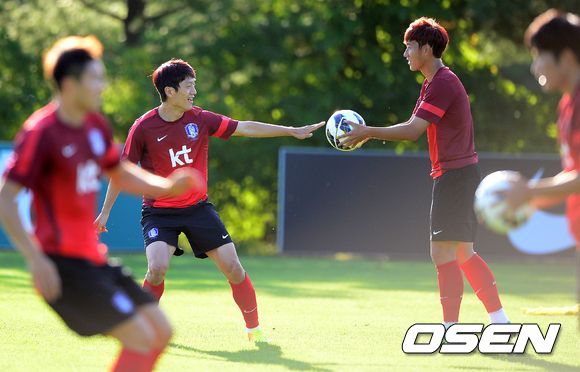 이청용과 손흥민이 짝을 이뤄 헤딩 연습을 하고 있다.