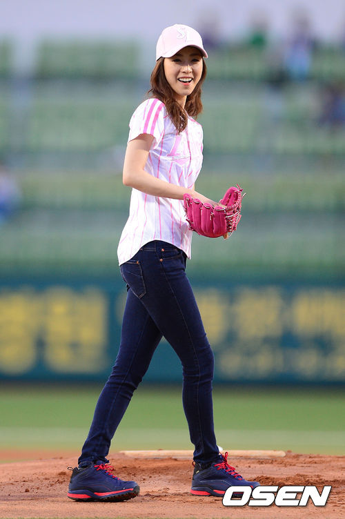 4일 오후 대구구장에서 열린 '2013 한국야쿠르트 세븐 프로야구' 삼성 라이온즈와 KIA 타이거즈의 경기에 앞서 배우 이연희가 시구를 위해 입장하고 있다