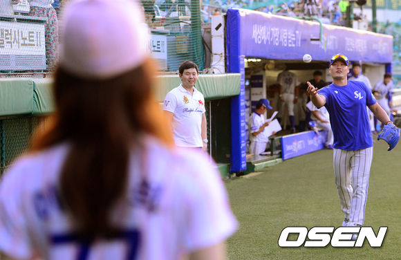 4일 오후 대구구장에서 열린 '2013 한국야쿠르트 세븐 프로야구' 삼성 라이온즈와 KIA 타이거즈의 경기에 앞서 시구 나서는 배우 이연희가 삼성 오승환과 캐치볼을 던지고 있다
