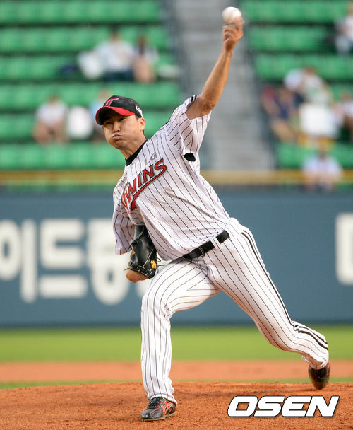 4일 오후 서울 잠실야구장에서 열린 2013 한국야쿠르트 세븐프로야구 LG 트윈스와 SK 와이번스의 경기, 1회초 무사에서 LG 선발투수 신재웅이 힘차게 공을 던지고 있다.