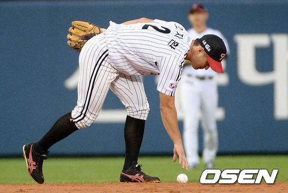 4일 오후 서울 잠실야구장에서 열린 2013 한국야쿠르트 세븐프로야구 LG 트윈스와 SK 와이번스의 경기, 2회초 2사에서 LG 오지환이 SK 김상현의 내야땅볼 타구를 놓치고 있다.
