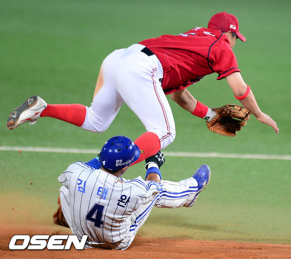 4일 오후 대구구장에서 열린 '2013 한국야쿠르트 세븐 프로야구' 삼성 라이온즈와 KIA 타이거즈의 경기, 2회말 삼성 정현의 내야땅볼때 KIA 유격수 박기남과 1루 주자 김태완이 충돌하고 있다.