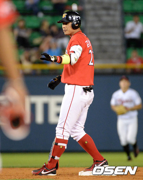 4일 오후 서울 잠실야구장에서 열린 2013 한국야쿠르트 세븐프로야구 LG 트윈스와 SK 와이번스의 경기, 4회초 2사 2루에서 SK 김상현이 좌전 적시 2루타를 치고 타임을 외치고 있다.