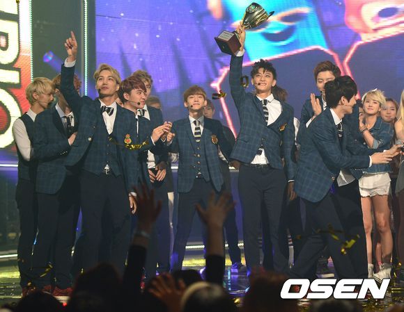 그룹 EXO가 4일 오후 서울 광장동 유니클로 악스홀에서 진행된 MBC MUSIC '쇼 챔피언' 1위를 차지한 뒤 기뻐하고 있다.