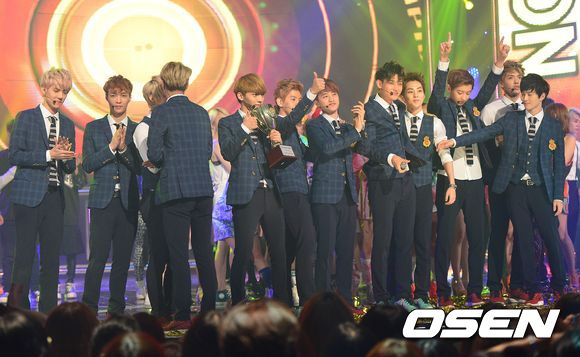 그룹 EXO가 4일 오후 서울 광장동 유니클로 악스홀에서 진행된 MBC MUSIC '쇼 챔피언' 1위를 차지한 뒤 팬들에게 인사하고 있다.