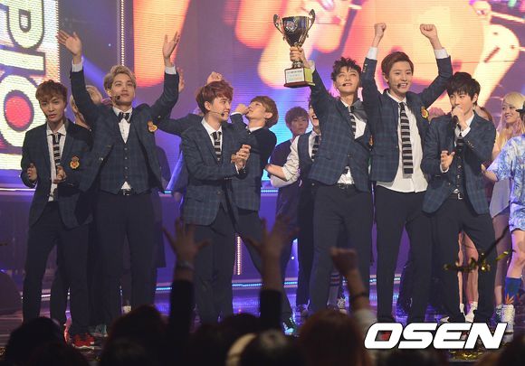그룹 EXO가 4일 오후 서울 광장동 유니클로 악스홀에서 진행된 MBC MUSIC '쇼 챔피언' 1위를 차지한 뒤 소감을 전하고 있다.