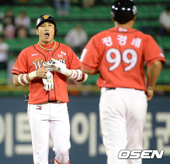 4일 오후 서울 잠실야구장에서 열린 2013 한국야쿠르트 세븐프로야구 LG 트윈스와 SK 와이번스의 경기, 4회초 2사에서 SK 김강민이 중전 2루타를 치고 타임을 외치고 있다.