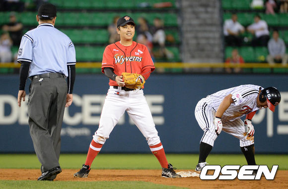 4일 오후 서울 잠실야구장에서 열린 2013 한국야쿠르트 세븐프로야구 LG 트윈스와 SK 와이번스의 경기, 5회말 무사 1루에서 LG 오지환 타석 때 1루주자 이병규에게 도루를 허용한 SK 나주환이 아쉬운 표정을 짓고 있다.