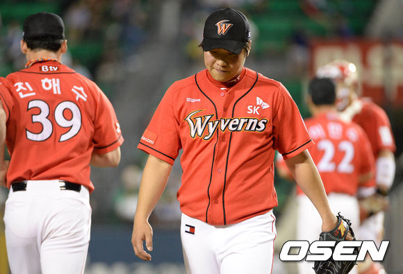 4일 오후 서울 잠실야구장에서 열린 2013 한국야쿠르트 세븐프로야구 LG 트윈스와 SK 와이번스의 경기, 6회말 2사 2루에서 LG 박용택 타석 때 SK 백인식이 마운드를 내려가고 있다.
