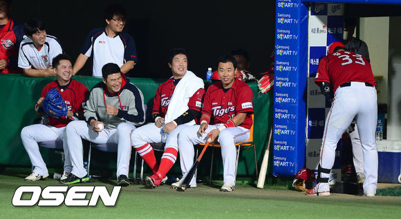 4일 오후 대구구장에서 열린 '2013 한국야쿠르트 세븐 프로야구' 삼성 라이온즈와 KIA 타이거즈의 경기, 6회초 2사 KIA 김주형의 솔로홈런때 서재응 박기남 등 동료들이 김주형에게 장난을 치고 있다.