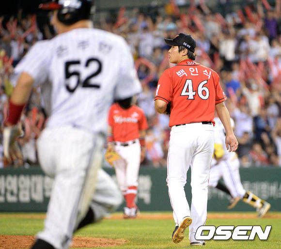 4일 오후 서울 잠실야구장에서 열린 2013 한국야쿠르트 세븐프로야구 LG 트윈스와 SK 와이번스의 경기, 6회말 2사 2루에서 SK 백인식이 LG 정성훈에게 좌전 동점 적시타를 허용하며 타구를 바라보고 있다.