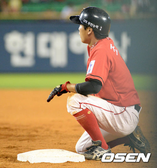 4일 오후 서울 잠실야구장에서 열린 2013 한국야쿠르트 세븐프로야구 LG 트윈스와 SK 와이번스의 경기, 8회초 2사 1루에서 SK 1루주자 조동화가 견제사 당하고 아쉬워하고 있다.