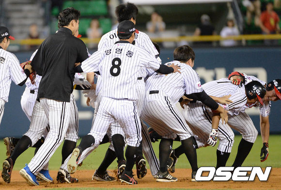 LG가 이병규(7번)의 끝내기타로 전날 패배를 설욕하며 15일 만에 1위 탈환 기회를 잡았다.