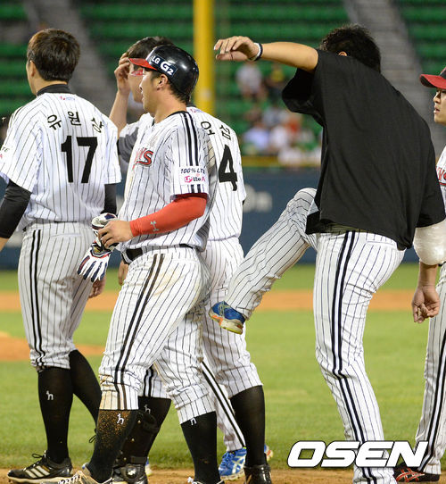 9회말 무사 1,2루에서 끝내기 안타를 친 LG 이병규가 동료들에게 축하를 받고 있다. /sunday@osen.co.kr