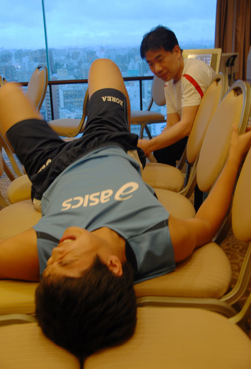 환경은 열악하다. 주최측에서는 각 팀에게 최소한의 방만 내주었다. 일본 호텔의 특성상 방이 작다. 여러가지 장비를 비치하고 치료할만한 방이 없다. 대표팀은 적당한 공간을 찾아 호텔 이곳저곳을 헤매고 다녔다. 3일은 8층에 있는 컨퍼런스룸, 4일에는 18층에 있는 미팅룸을 이용했다. 의자를 이어붙여 침대를 만들었다. 1시간 밖에 사용하지 못했다.