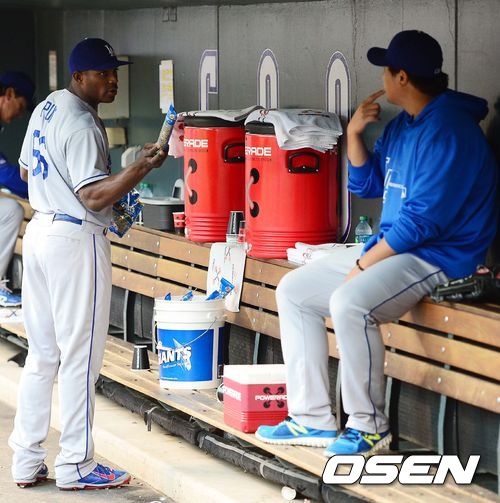 5일 (이하 한국시간) 미국 콜로라도주 덴버 쿠어스 필드에서 열린 2013 메이저리그 콜로라도 로키스와 LA 다저스의 경기, 덕아웃에서 푸이그가 류현진에게 간식을 골라주고 있다.