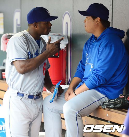 5일 (이하 한국시간) 미국 콜로라도주 덴버 쿠어스 필드에서 열린 2013 메이저리그 콜로라도 로키스와 LA 다저스의 경기, 덕아웃에서 류현진과 푸이그가 얘기를 나누고 있다.