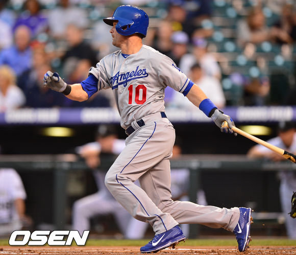 5일 (이하 한국시간) 미국 콜로라도주 덴버 쿠어스 필드에서 열린 2013 메이저리그 콜로라도 로키스와 LA 다저스의 경기, 1회초 2사 주자 2루 다저스 4번타자 마이클 영이 우전 선취 1타점 적시타를 날리고 있다.