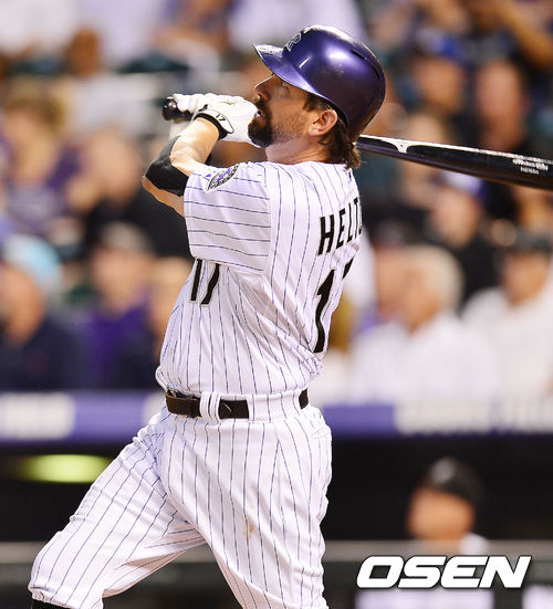 5일 (이하 한국시간) 미국 콜로라도주 덴버 쿠어스 필드에서 열린 2013 메이저리그 콜로라도 로키스와 LA 다저스의 경기, 2회말 선두타자 토드 헬튼이 우중월 솔로홈런을 날리고 있다.