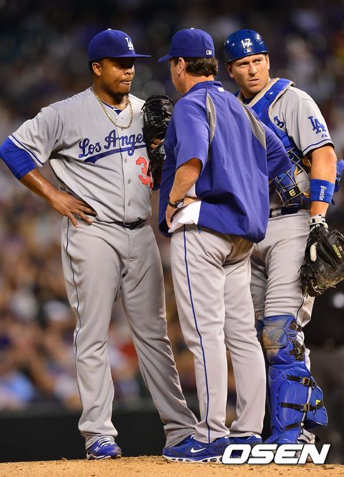 5일 (이하 한국시간) 미국 콜로라도주 덴버 쿠어스 필드에서 열린 2013 메이저리그 콜로라도 로키스와 LA 다저스의 경기, 2회에 릭 허니컷 투수 코치가 마운드에 올라 다저스 선발 에디슨 볼케스와 얘기를 나누고 있다.