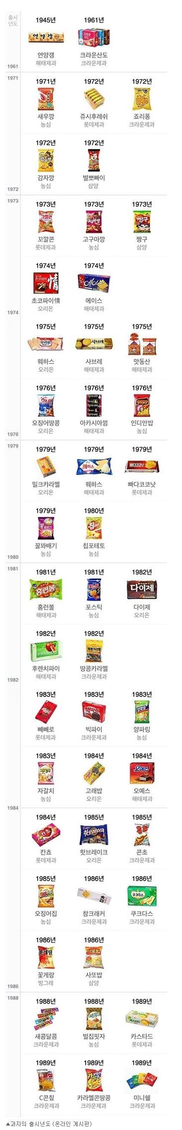 과자의 출시년도를 확인한 네티즌은 "연양갱이 우리 할아버지 나이라니", "생각보다 오래된 과자의 역사에 놀라고 갑니다", "나 어릴땐 새우깡이 100원이었는데 격세지감 느낀다" 등 다양한 반응을 보였다.