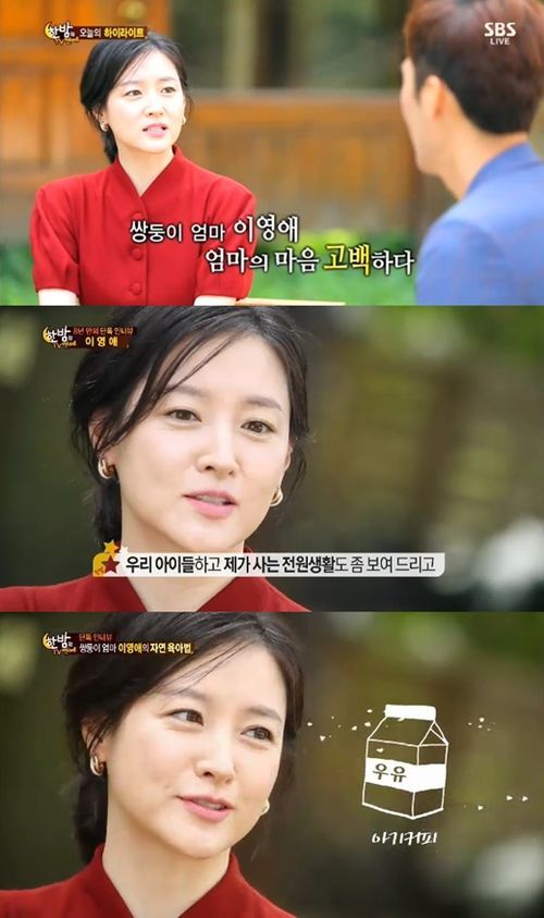 이날 이영애는 전원생활을 하고 있는 것에 대해 "(아이들이)처음 배우는 단어가 개구리, 거미다. 블루베리, 상추, 가지, 토마토 같은 것을 직접 재배해 아이들도 재미있어한다"라고 말했다.