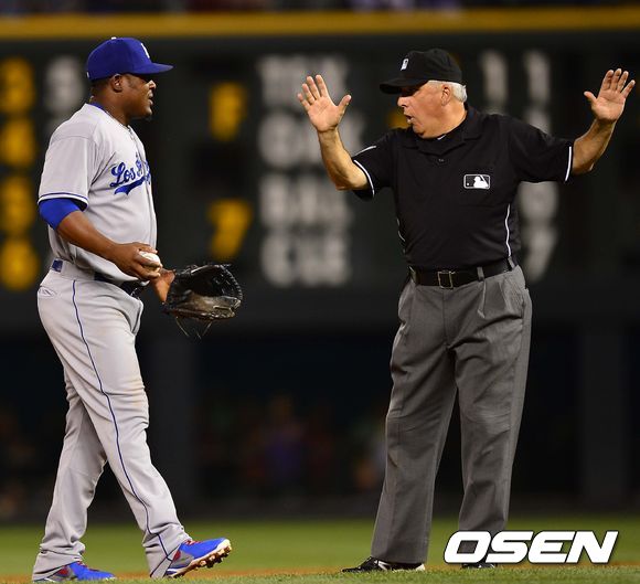 5일 (이하 한국시간) 미국 콜로라도주 덴버 쿠어스 필드에서 열린 2013 메이저리그 콜로라도 로키스와 LA 다저스의 경기, 3회말 무사 주자 1루 콜로라도 툴로비츠키의 땅볼때 1루 주자 러틀리지가 3루로 진루 했다가 귀루, 2루에서 다저스 유리베에게 태그를 당했으나 심판이 세이프 처리를 했다. 이에 유리베가 항의하고 있다.