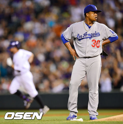 5일 (이하 한국시간) 미국 콜로라도주 덴버 쿠어스 필드에서 열린 2013 메이저리그 콜로라도 로키스와 LA 다저스의 경기, 2회말 선두타자 토드 헬튼이 우중월 솔로홈런을 날린 후 그라운드를 돌고 있고 다저스 선발 에디슨 볼케스가 아쉬워하고 있다.