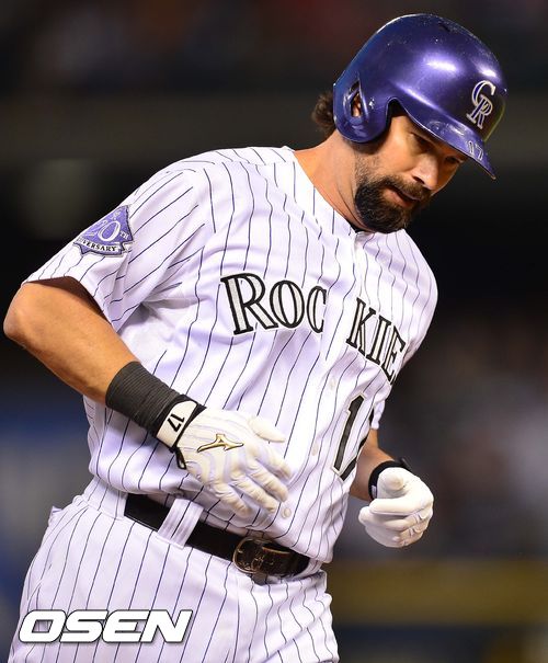 5일 (이하 한국시간) 미국 콜로라도주 덴버 쿠어스 필드에서 열린 2013 메이저리그 콜로라도 로키스와 LA 다저스의 경기, 2회말 선두타자 토드 헬튼이 우중월 솔로홈런을 날린 후 그라운드를 돌고 있다.