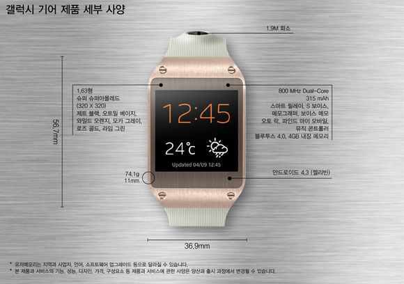 삼성전자의 '갤럭시 기어'는 1.63인치 수퍼아몰레드 디스플레이, 스테인레스 프레임, 4GB 내장 메모리가 적용됐으며 무게는 73.8g으로 블랙, 베이지, 오렌지, 그레이, 골드, 그린 등 총 6가지 색상으로 출시될 예정이다.