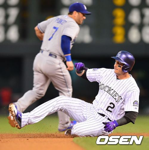 5일 (이하 한국시간) 미국 콜로라도주 덴버 쿠어스 필드에서 열린 2013 메이저리그 콜로라도 로키스와 LA 다저스의 경기, 1회말 1사 주자 3루 콜로라도 툴로비츠키가 좌전 1타점 2루타를 날린 후 2루에서 세이프되고 있다.