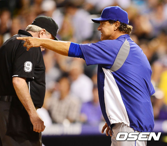 5일 (이하 한국시간) 미국 콜로라도주 덴버 쿠어스 필드에서 열린 2013 메이저리그 콜로라도 로키스와 LA 다저스의 경기, 6회말 1사 주자 없는 상황에서 콜로라도 르마이유의 헛스윙이 파울로 번복되자 다저스 돈 매팅리 감독이 강하게 항의하고 있다.