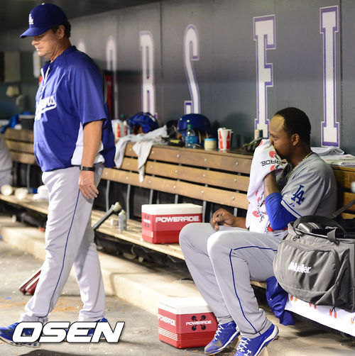 5일 (이하 한국시간) 미국 콜로라도주 덴버 쿠어스 필드에서 열린 2013 메이저리그 콜로라도 로키스와 LA 다저스의 경기, 덕아웃에서 다저스 선발 에디슨 볼케스가 아쉬운 표정을 짓고 있다.