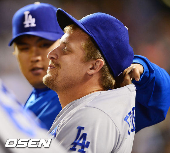 5일 (이하 한국시간) 미국 콜로라도주 덴버 쿠어스 필드에서 열린 2013 메이저리그 콜로라도 로키스와 LA 다저스의 경기, 덕아웃에서 류현진이 페데로위치의 등에 해바라기씨를 넣고 있다.