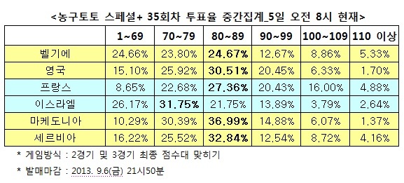 투표율을 살펴보면, 홈팀으로 지정된 프랑스는 80~89점대가 27.36%로 최다를 기록했고, 원정팀 이스라엘은 70~79점대가 31.75%로 1순위를 차지했다. .