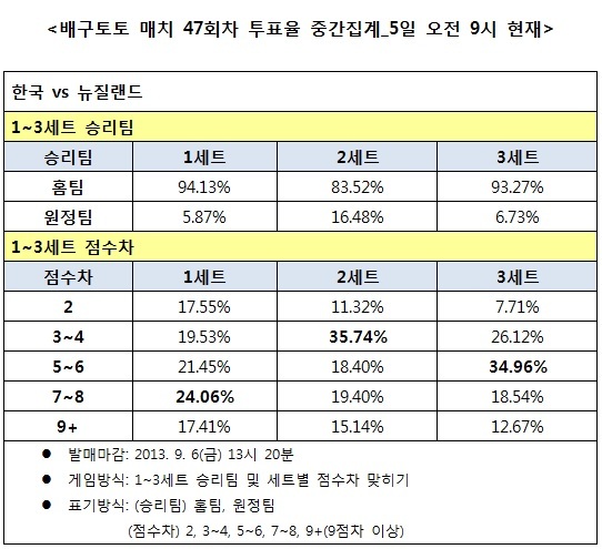 1~3세트 승리팀과 점수차를 맞히는 배구토토 매치 게임에서 세트별 예상 승리팀은 1세트 한국 승리(94..13%), 2세트 한국 우세(83.52%), 3세트 한국 승리(93.27%)로 나타나, 3세트까지 한국이 우세할 것으로 예상됐다.