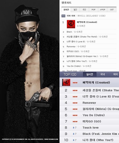 특히 해당 4개 차트에서는 지드래곤이 이날 공개한 신곡 7곡이 상위권을 줄지어 차지하는 '줄세우기' 신공을 선보이는 기염을 토하기도 했다.