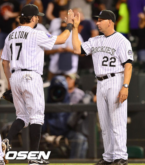 경기를 마치고 콜로라도 월트 와이스 감독이 이날 홈런을 기록한 토드 헬튼과 하이파이브를 나누고 있다. / rumi@osen.co.kr