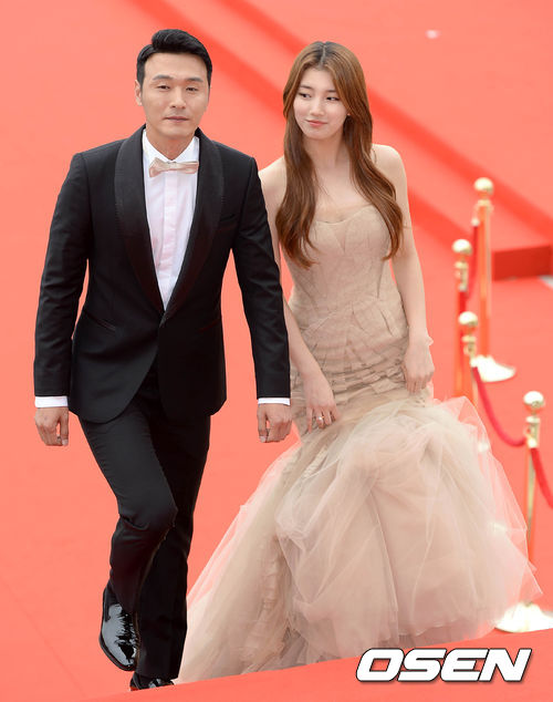 배우 이성재와 수지가 레드 카펫을 밟고 있다.