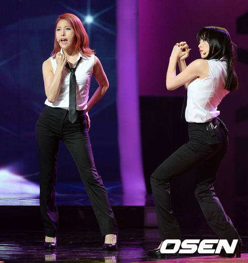 카라 박규리와 강지영이 화려한 공연을 펼치고 있다.