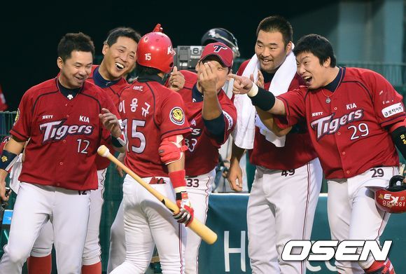 5일 오후 서울 잠실야구장에서 열린 '2013 한국야쿠르트 세븐 프로야구' 두산 베어스와 KIA 타이거즈의 경기, 1회초 무사에서 KIA 이용규가 선두타자 홈런을 날리고 더그아웃에서 동료선수들과 기뻐하고 있다.